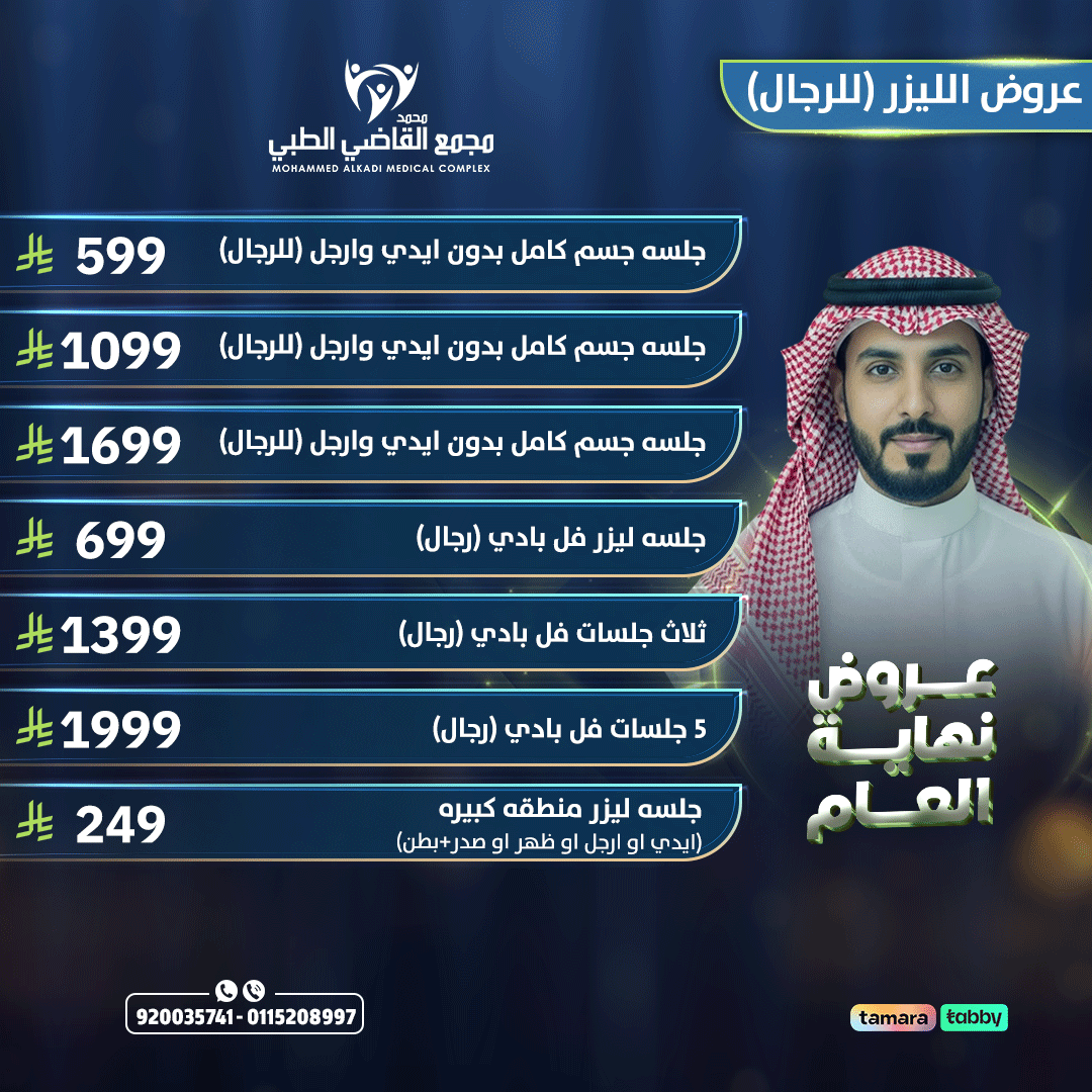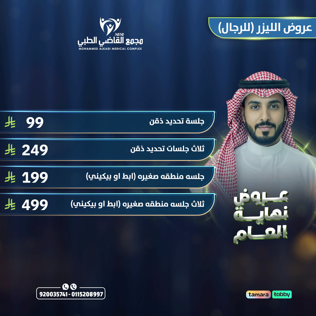 عروض الليزر للرجال مصممة لتقليل نمو الشعر غير المرغوب فيه بطريقة آمنة وفعّالة، مع مراعاة طبيعة بشرة وشعر الرجال. الجلسات تساعد على تقليل كثافة الشعر تدريجيًا وتحسين نعومة الجلد، وتتم باستخدام أجهزة حديثة وتحت إشراف مختصين لضمان الراحة والنتائج الطبيعية.
