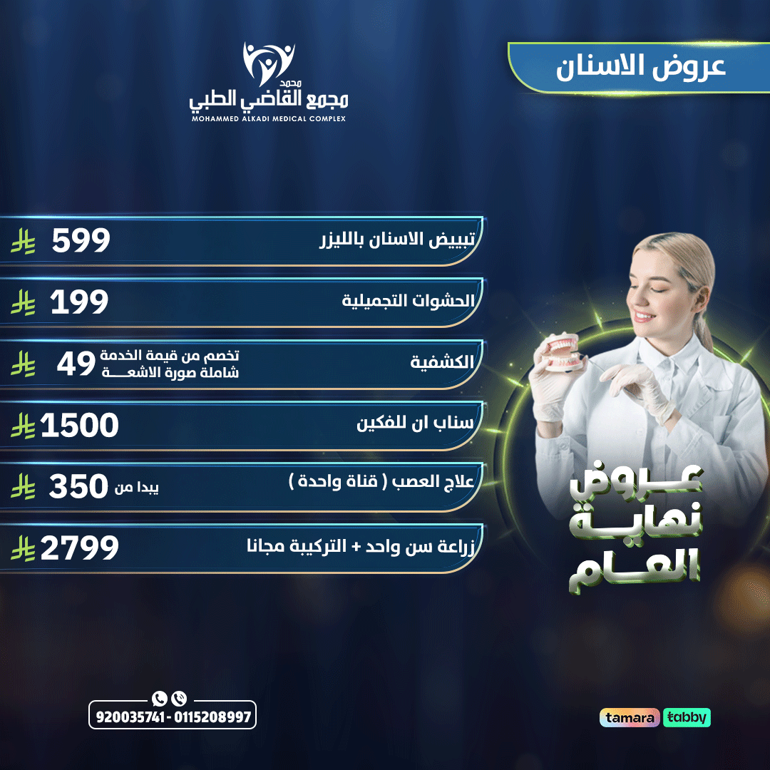 عروض الأسنان تتيح لك العناية بابتسامتك من خلال مجموعة من الخدمات السنية التي تهدف إلى تحسين صحة ومظهر الأسنان بطريقة آمنة وتحت إشراف أطباء متخصصين. تشمل العروض إجراءات تساعد على تنظيف الأسنان، تحسين لونها، ودعم صحة اللثة، باستخدام تقنيات حديثة تضمن الراحة والنتائج الطبيعية.