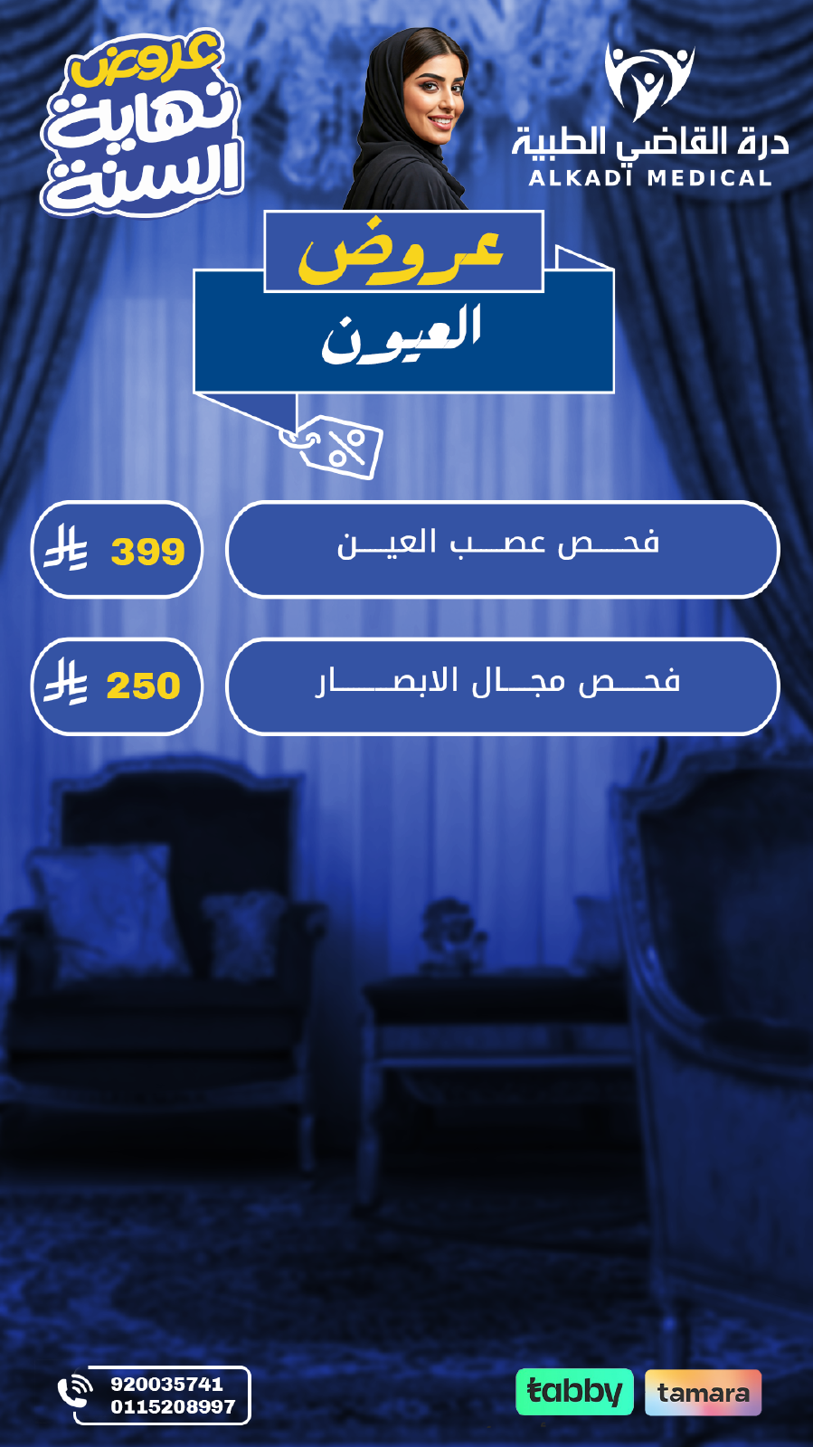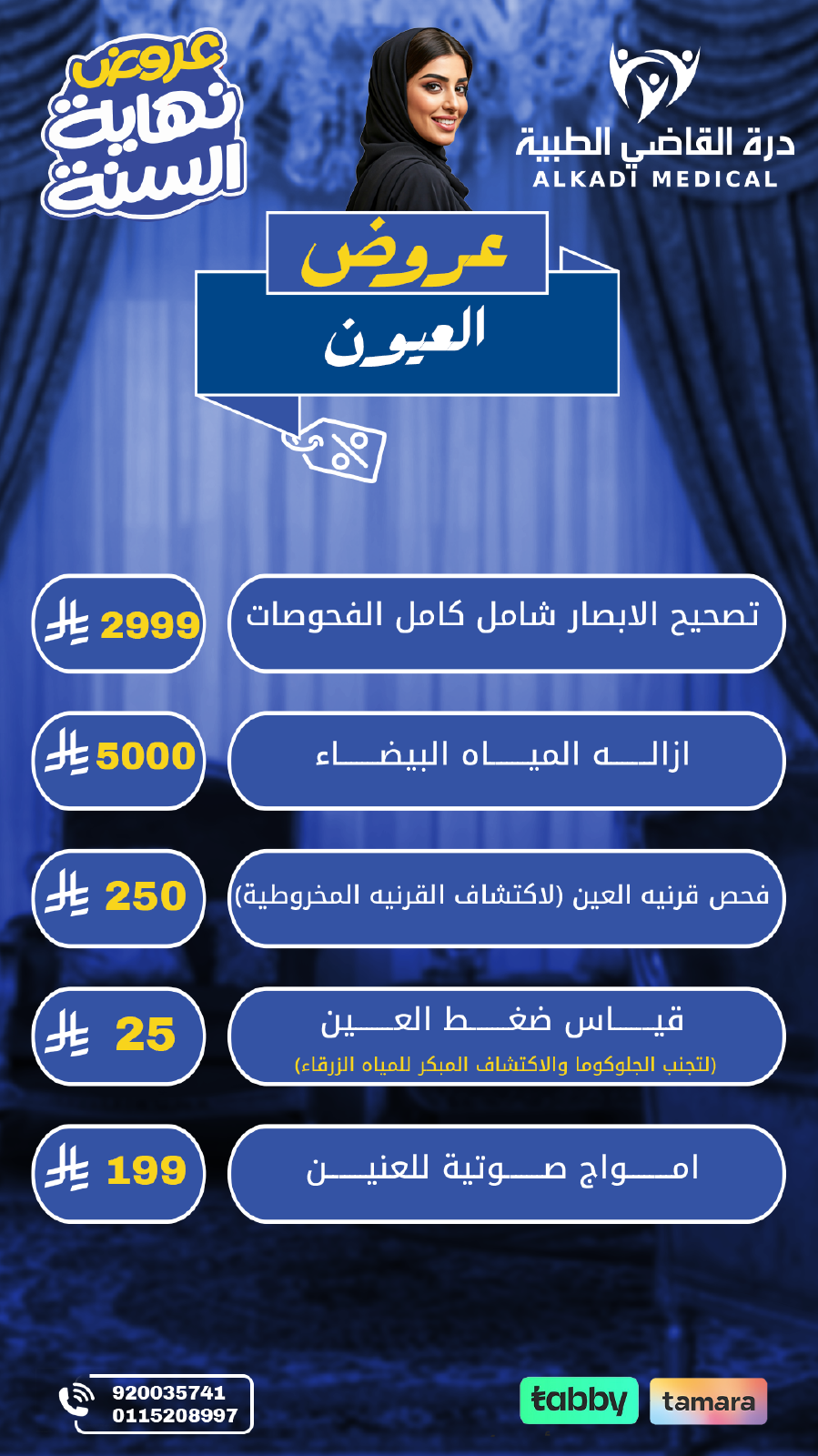 عروض العيون توفر باقة متكاملة من خدمات فحص وتشخيص صحة العين تحت إشراف أطباء متخصصين وبأجهزة دقيقة. تشمل العروض فحوصات شاملة لتقييم الإبصار، القرنية، عصب العين وضغط العين، مع المساعدة على الاكتشاف المبكر للمشكلات الشائعة مثل القرنية المخروطية والمياه الزرقاء والبيضاء. تهدف هذه الفحوصات إلى الاطمئنان على صحة العين ودعم الرؤية السليمة بطريقة آمنة ودقيقة.